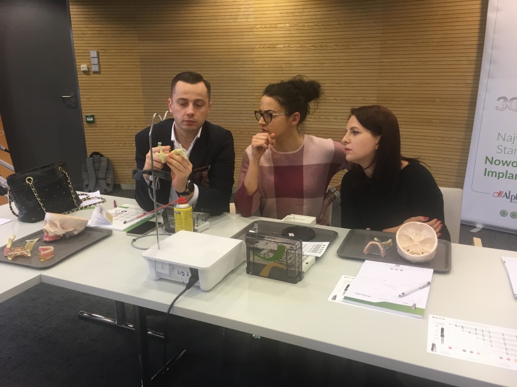 Była to okazja, by dowiedzieć się „z czym się je” implantologię w stomatologii. Poznaliśmy historię implantów i obecnie dostępne na rynku systemy firmy Alpha Bio. Na przypadkach klinicznych zobaczyliśmy przebieg diagnostyki, planowania i przebiegu leczenia implantoprotetycznego. Na zakończenie – zgodnie z tytułem warsztatu – każdy uczestnik wszczepił swój pierwszy implant na modelu żuchwy.